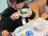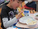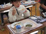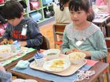 2年生の教室をのぞいてみると、流石2年生、配膳にも慣れて、スムーズに準備し、みんなで「いただきます。」をしていました。少しずつ味わって食べている子、おかわりをしてもりもりと食べている子と様々でしたが、友達と食べる給食にみんなとてもうれしそうでした。