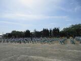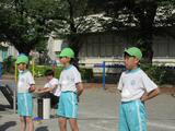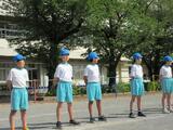 今日は、体操隊形について全員で確認しました。体操ができるように、個々の間隔を開けて広がることを「体操隊形に開く」といいます。高学年の児童はさっと行動し、きれいな隊形を作ることができますが、1年生は、全体に対する自分の位置を把握することがとても難しく、なかなか間隔を開けて整列することができません。そこで、体育委員の児童が1年生の背中を優しく押したり、「こっちだよ。」と声をかけたりして手伝っていました。