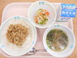 あおなピラフ サケのこうそうやき コーンサラダ ウインナーのトマトスープ