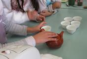 子供たちは玄米茶やほうじ茶が気に入ったようで、「美味しい。」「なんかおせんべいの味に似ている。」「いや、お茶漬けかもしれない。」等と言いながら、笑顔でいただいていました。また、お茶の淹れ方もご指導いただき、湯呑に少しずつ順番にいれて、とてもきれいなお茶色が出せていました。