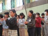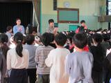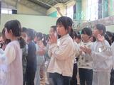 今日は、音楽朝会でした。今日の内容は、みんなでボディパーカッションをやってみようということで、音楽委員の子供たちが見本を見せ、それを見ながら、全員で手をたたいたり、おなかやひざ、肩などをたたいたりして楽しく音を奏でました。音楽委員の5・6年生は進行やボディパーカッションの先導など、大変堂々と行っていました。