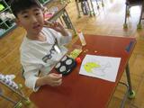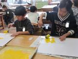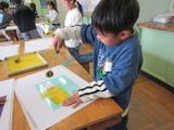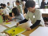 図工室をのぞくと、2年生が「うつそうわたしの形」という題材で学習をしていました。プラスチックシートを好きな形に切り抜き、画用紙の上に置いて絵の具をつけたローラーを転がすと、とても美しい形が画用紙に浮かび上がりました。子供それぞれ、様々な形を切り抜いていましたが、画用紙にその形が現れると嬉しそうに教えてくれました。
