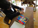 今日は、くすのき学級をのぞいてみると、ちぎり絵を作成していました。めあては、「静かに集中して作る。」です。子供たちは、すぐに吹き飛んでしまいそうな小さな折り紙の紙片を、指で丁寧につまんで、画用紙に貼り、色とりどりの絵を作っていました。確かに、今日の作業は「静かに集中」しないとできません。くすのき学級の子供たちは、口を閉じ、真剣に作業をしていました。自分たちで折り紙をちぎって作った紙片が様々な色でたくさんあり、その中から好きな色を選んで作っていました。ほかにも、地域の方にお手紙を書いている子もいました。